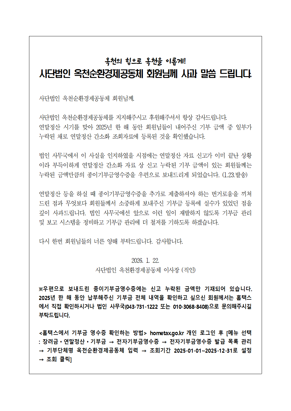 우편으로 보내드린 종이기부금영수증에는 신고 누락된 금액만 기재되어 있습니다. 2025년 한 해 동안 납부해주신 기부금 전체 내역을 확인하고 싶으신 회원께서는 홈택스에서 직접 확인하시거나 법인 사무국(043-731-1222 또는 010-3068-8408)으로 문의해주시길 부탁드립니다.
