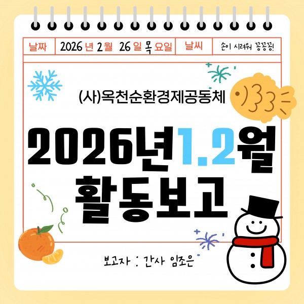 (사)옥천순환경제공동체 26년 1.2월 활동 소식 공유드립니다안녕하세요, 옥천순환경제공동체 입니다! 2026년 다들 잘 보내고 계신가요? 법인 사무국에서도 2026년을 힘차게 나아가기 위해서 많은 준비를 하고 있습니다, 26년에는 더욱더 다양한 활동과 회원님들을 만날 수 있는 자리를 만들어가려고 합니다, 회원님들께서는 법인의 활동에 대해 많은 관심을 가져주시면은 감사하겠습니다!! 그리고 3월부터는 법인의 활동을 카드뉴스가 아닌, 지면소식지로 전달해드리려고 합니다! 지면소식지에는 더욱 다양한 소식들이 담겨 있을 예정이니 지면 소식지도 많은 관심 부탁드립니다! 곧 봄이 찾아올 것 같으면서, 아직 겨울의 끝을 붙잡고 있는 것 같습니다. 아직 환절기로 인한 감기 조심하시길 바라며, 회원님의 일상에 항상 평안이 깃들기를 바랍니다 :-)